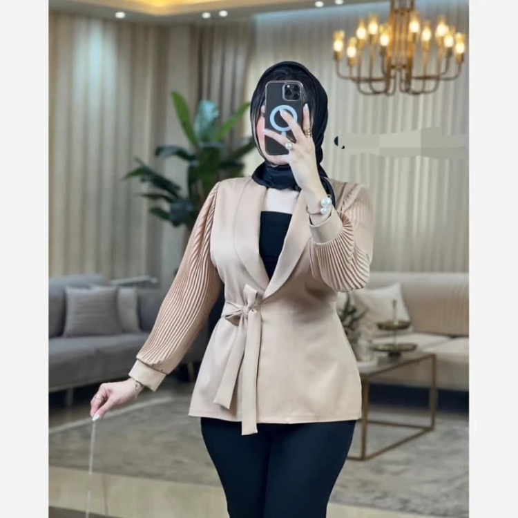 سلام جنس این کت زیبا، مازراتی گرم بالا و جنس آستین ها کرپ حریر پلیسه میباشد، آستین ها بدن نمایی ندارن و کاملا پوشیده و محجب است جلوی کار با بند کمری بسته میشه